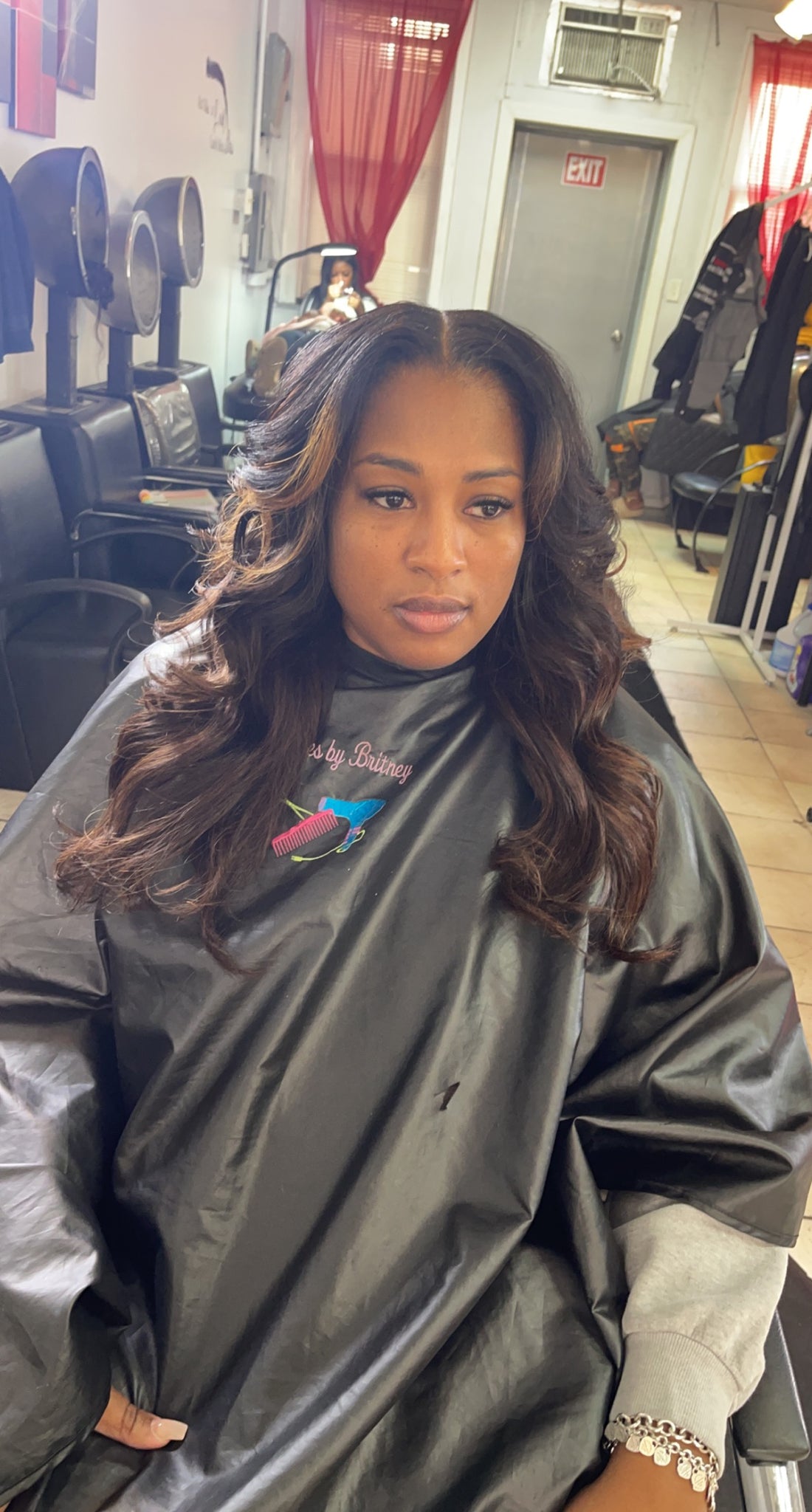 This quick weave service includes premium bundled hair up to 24 inches in the texture of your choice. Install, styling, and basic customization are included.